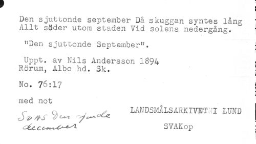 //// f //// t //// ) //// Den sjuttonde september Då skuggan syntes lång ' //// Allt säder utom staden Vid solens nedergång. ^ - //// ^Den sjuttonde September". //// Uppt. av Nils Andersson 18% //// Rörum, Albo hd. Sk. ! //// i //// No. 76:17 I //// g //// B //// med not //// r Q , ^ LANOSMÅLSARKIVET/1 LUND //// SVAKop : ////