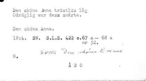 //// Den sköna Anna tröstlös låg //// Odräglig var desg smärta. //// Den sköna Anna. //// 18:4. SN. S.L.S. 422 s.67 a- 68 a //// nr $2. //// N. //// ÅBO ////