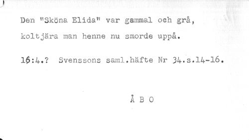 //// Den "Sköna Elida" var gammal och grå, //// koltjära man henne nu smorde uppå. //// 1$:4.? Svenssons saml*häfte Nr 34*s.14-16. //// ÅBO ////