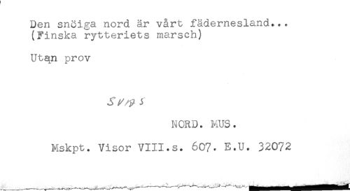 //// Den snöiga nord är vårt fädernesland... //// (Finska rytteriets marsch) //// Utan prov //// NORD. MUS. //// Mskpt. Visor VIII.s. 607. E.U. 32072 ////