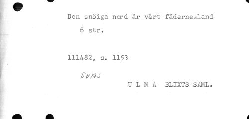 //// Den snöiga nord är vårt fädernesland //// 6 str. //// 111432, s. 1153 //// * //// U L M A BLIXTS SAKL. //// * ////