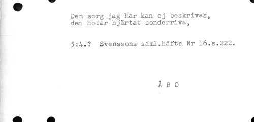 //// Den sorg jag har kan ej beskrivas, //// den hotar hjärtat sönderriva, //// 5:4.? Svenssons saml.häfte Nr 16.s.222. //// ÅBO ////