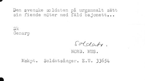 //// Den svenske soldaten på urgammalt sätt //// sin fiende möter med fäld bajonett... //// Sk //// Genarp //// NORD. MUS. //// Mskpt. Soldatsånger. E.U. 33654 ////