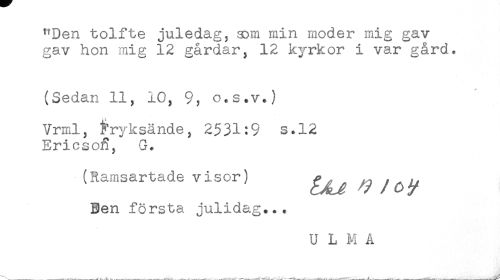 //// "Den tolfte juledag^ som min moder mig gav //// gav hon mig 12 gårdar, 12 kyrkor i var gård, //// (Sedan 11, 10, 9? o.s.v.) //// Vrml, ^ryksände, 2531:9 s.12 //// Ericso^, G. //// (Ramsartade visor) ^^ y ^^ //// Ben första julidag... //// U L M A ////
