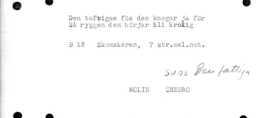//// Den toftigae föa den knogar ja för //// Så ryggen den börjar bli kroiig //// B 18 Skomakaren. 7 str.mel.not. //// - //// - //// MOLIN ÖREBRO ////