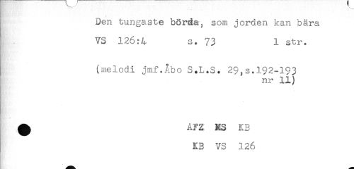 //// I Den tungaste börda, som jorden kan bära //// VS 126:4 s. 73 1 str. //// (melodi jmf.Åbo S.L.S. 29,s.192-193 //// nr 11) //// ^ AFZ KS KB //// KB VS 126 ////