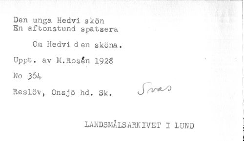 //// Den unga Hedvi skön //// En aftonstund spatsera ' //// Om Hedvi den sköna. //// Uppt. av M.Rosén 1928 //// No 364 //// Reslöv, Onsjö hd. Sk. //// LANDSMÅLSARKIVET I LUND ^ //// n ////
