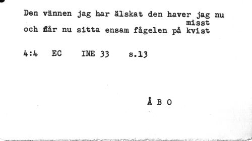 //// Den vännen jag har älskat den haver jag nu //// misst //// och får nu sitta ensam fågelen på kvist //// 4:4 EC INE 33 s.13 //// ÅBO ////