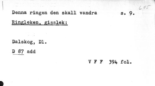 //// ! //// Denna ringen den skall vandra s. 9. //// Ringleken, gisslek: //// ) //// '-- . - //// Dalskog, Dl. //// D 87 add //// V F F 394 fol. ////