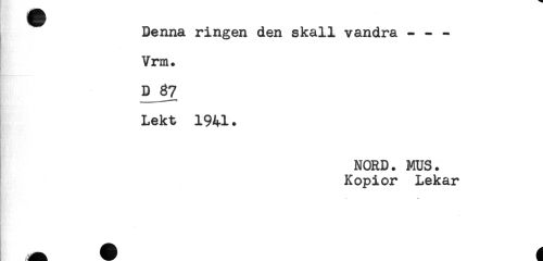 //// Denna ringen den skall vandra - - - //// Vrm. //// D 37 //// Lekt 1941. //// NORD. MUS. //// Kopior Lekar ////