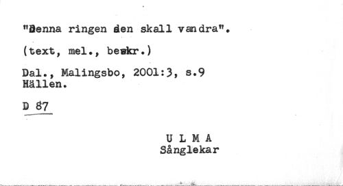 //// "Benna ringen den skall vandra", //// (text, mel., beskr.) //// Dal., Malingsbo, 2001:3, s.9 //// Hällen. //// D 87_ //// U L M A //// Sånglekar ////