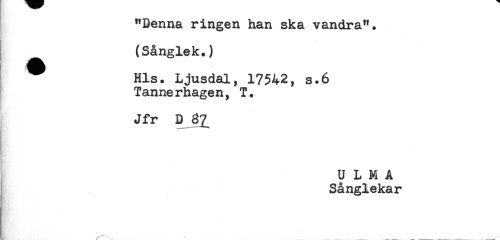 //// "Denna ringen han ska vandra". //// (Sånglek.) //// ^ Hls. Ljusdal, 17542, s.6 //// Tannerhagen, T. //// Jfr D 37 //// U L M A //// Sånglekar ////