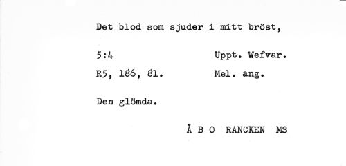 //// Det blod som sjuder i mitt bröst, //// 5:4 Uppt. Wefvar. //// R5, 186, 81. Mel. ang. //// Den glömda. //// ÅBO RANCKEN MS ////