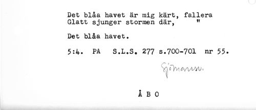 //// Det blåa havet är mig kärt, fallera //// Glatt sjunger stormen där, " //// Det blåa havet. //// 5:4. PA S.L.S. 277 s.700-701 nr 55. ////