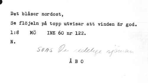 //// Bet blåser nordost, //// Se flöjeln på topp utvisar att vinden år god. //// 1:8 MÖ INE 60 nr 122. //// N. //// ÅBO ////