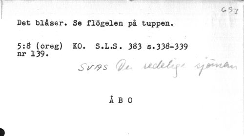 //// ! //// Det blåser. Se flögelen på tuppen. //// i //// i //// <- * //// 5:8 (oreg) KO. S.L.S. 383 s.338-339 //// nr 139. //// ÅBO ////