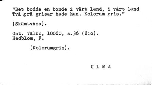 //// "Bet bodde en bonde i vårt land, i vårt land //// Två grå grisar hade han. Kolorum gris." //// (Skämtvisa). //// Gst. Valbo, 10060, s.36 (8:0). //// Hedblom, F. //// (Kolorumgris). //// U L M A ////