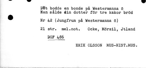 //// D^t bodde en bonde på Westermanna ö //// Han sålde din dotter for tre kakor bröd //// ^ Nr 42 (Jungfrun på Westermanna ö) //// 21 str. mel.not. Ocke, Mörsil, Jtland //// DGF 486^ //// ERIK OLSSON MUS-HIST.MUS. ////