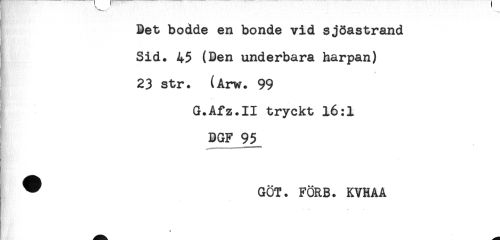 //// ! Bet bodde en bonde vid sjöastrand //// Sid. 45 (Ben underbara harpan) //// .j //// 23 str. (Arw. 99 //// G.Afz.II tryckt 16:1 //// DGF 95 //// -... //// ^ GÖT. FÖRB. KVHAA //// t' //// C * ////