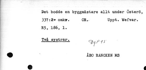 //// Bet bodde en byggmästare allt under Österö, //// i 33?:^ omkv. 0R+- Uppt. Wefvar. //// w * //// R5, 186, 1. //// Två systrar. //// ^ ÅBO RANCKEN MS ////