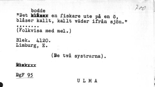 //// bodde ^ //// "Det WUxKT en fiskare ute på en 8, //// blåser kallt, kallt väder ifrån sjön." //// *** + +* + + //// (Folkvisa med mel.) //// Blek. 4120. //// Limburg, E. //// * //// (Be två systrarna). //// . //// ! //// Rizkxxx //// .,. i //// DgF 95 //// U L M A = ////