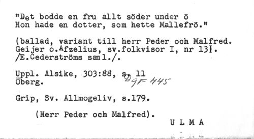 //// "Bet bodde en fru allt söder under ö //// Hon hade en dotter, som hette Mallefrö." //// (ballad, variant till herr Peder och Malfred. //// Geijer o.Afzelius, sv.folkvisor I, nr 13!* //// /E.Cederströms sanl./. //// Uppl. Alsike, 303:33, 11 //// Öberg. //// Grip, Sv. Allmogeliv, s.179* //// (Herr Peder och Malfred). //// U L M A //// *< * - * * ////