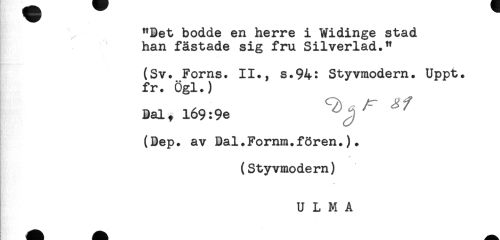 //// I ... "Bet bodde en herre i Widinge stad //// I han fåstade sig fru Silverlad." //// (Sv. Forns. II., s.94: Styvmodern. Uppt. //// fr. Ögl.) //// Bal^ 169:9e //// (Bep. av Bal.Fornm.fören.). //// (Styvmodern) //// U L M A ////