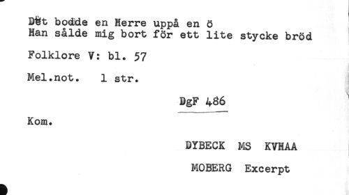 //// D^t bodde en Herre uppå en 8 //// Han sålde mig bort för ett lite stycke bröd //// Folklore V: bl. 57 //// j //// Mel.not. 1 str. //// DgF 486 //// Kom. //// DYBECK MS KVHAA //// MOBERG Excerpt ////