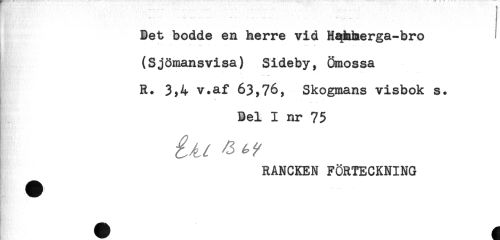 //// Det bodde en herre vid Hqhherga-bro //// - - //// (Sjömansvisa) Sideby, Ömossa //// R. 3)4 v.af 63,76, Skogmans visbok s. //// ^ .. * .. //// Del I nr 75 //// RANCKEN FÖRTECKNING ////