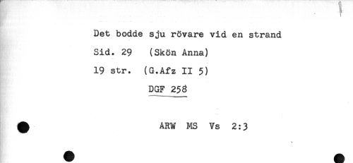 //// ......'...... " " //// Det bodde sju rövare vid en strand //// Sid. 29 (Skön Anna) //// * //// 19 str. (G.Afz II 5) //// .. //// DGF 258 //// ^ ARW MS Vs 2:3 ////