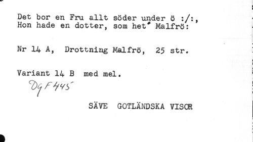//// ! //// Det bor en Fru allt söder under ö :/:, //// Hon hade en dotter, som het" Malfrö: //// i //// Nr 14 A, Drottning Malfrö, 25 str. //// t //// Variant 14 B med mel. //// t //// SÅVE GOTLÄNDSKA VISCR //// ' //// i //// ! ////