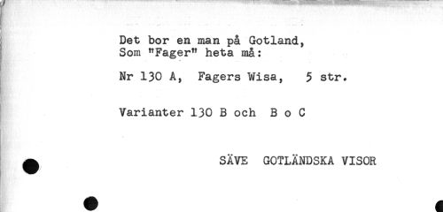 //// Det bor en man på Gotland, //// Som "Fager" heta må: //// ** -. .... //// Nr 130 A, Fagers Wisa, 5 str. //// Varianter 130 B och B o C //// ^ SÄVE GOTLÄNDSKA VISOR //// p}' ^^^ ////