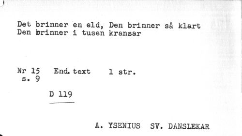 //// Det brinner en eld, Den brinner så klart //// Den brinner i tusen kransar //// i //// t //// t //// Nr 15 End* text 1 str. //// s. 9 //// D 119 //// A. YSENIUS SV. DANSLEKAR ////