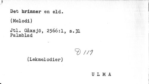 //// Det brinner en eld. //// (Melodi) ' //// Jtl. Gåxsjö, 2566:1, s.31 //// Palmblad //// * //// S) //// ///(Lekmelodier) //// U L M A : ////
