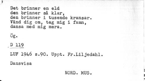 //// Det brinner en eld //// den brinner så klar, ' //// den brinner i tusende kransar. //// Vänd dig om, tag mig i famn, //// dansa med mig mera. ! //// Ög. //// LUF 1946 s.90. Uppt. Fr.Liljedahl. //// Dansvisa //// NORD. MUS. ^ //// 1 ////