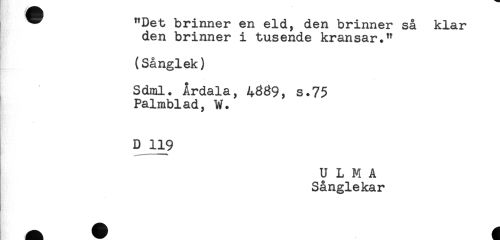 //// ^ "Det brinner en eld, den brinner så klar //// den brinner i tusende kransar." //// (Sånglek) //// Sdml. Årdala, 4369, s.75 //// Palmblad, W. //// D 119 ////