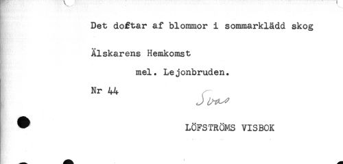 //// Det doftar af blommor i sommarklädd skog //// ** //// Älskarens Hemkomst //// mel. Lejonbruden. //// Nr 44 //// ^ LÖFSTRÖMS VISBOK //// * ^ . * . . < ////