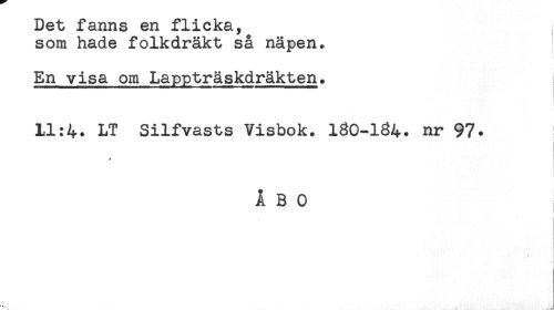 //// Det fanns en flicka, //// som hade folkdräkt så näpen. //// En visa om Lappträskdräkten. //// 11:4. LT Silfvästs Visbok. 130-164. nr 97. //// ÅBO //// - ////