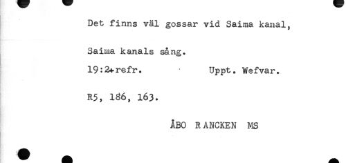 //// Det finns väl gossar vid Saima kanal, //// Saiiaa kanals sång. //// 19:3+refr. Uppt. Wefvar. //// R5, 136, 163. //// ÅBO R ANCKEN MS ////