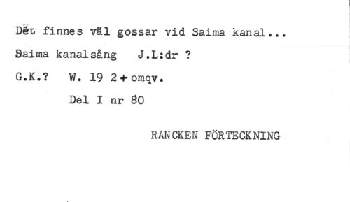 //// D&t finnes väl gossar vid Saima kanal... //// Baima kanalsång J.L:dr ? //// G.K.? W. 19 2+omqv. //// Del I nr 80 //// RANCKEN FÖRTECKNING ////