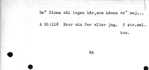 //// - ^ ... H //// ] . " *** ** * - -< * ' * . . .. //// De* finns väl ingen här,som känns ve* mej... //// A 91:113 Bror min Per eller jag. 5 str.mel. //// kom. //// ^ RA ////