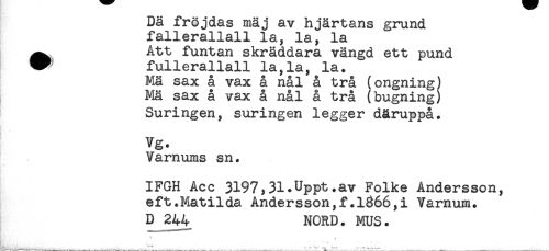 //// Dä fröjdas mäj av hjärtans grund //// fallerallall la, la, la //// ^ Att funtan skräddara vängd ett pund //// V fullerallall la,la, la. //// Mä sax å vax å nål å trå (ongning) //// Mä sax å vax å nål å trå (bugning) //// Suringen, suringen legger dåruppå. //// Vg. //// Varnums sn. //// IFGH Acc 3197)31.Uppt.av Folke Andersson, //// eft.Matilda Andersson,f.1366,i Varnum. //// D 244 NORD. MUS. //// 'S //// * //// _^_^^ ^ ^ ^ - ^ ^ sv-. . -4... ....... ....... ////