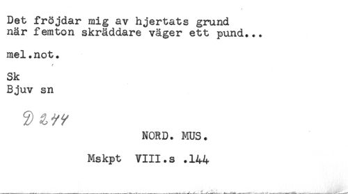 //// Det fröjdar mig av hjertats grund //// når femton skräddare väger ett pund... //// mel.not. //// Sk //// Bjuv sn //// * / ^ //// NORD. MUS. //// Mskpt VIII.s .144 ////