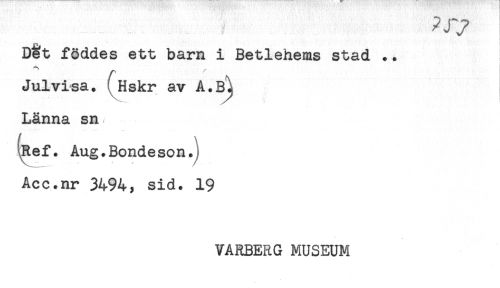 //// pj-y //// Det föddes ett barn i Betlehems stad .. //// ^ r i //// Julvisa. (Hskr av A.B^ //// Länna sn //// R e f. Aug .Bondeson.; //// ^^ . -- //// /Acc.nr 3494, sid. 19 //// VARBERG MUSEUM ////