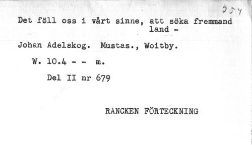 //// Det föll oss i vårt sinne, att söka fremmand //// land - //// "** * * - - - - ___<____ //// Johan Adelskog. Mustas., Woitby. //// W. 10.4 - - m. //// Del II nr 679 //// t //// i //// t //// RANCKEN FÖRTECKNING //// < //// i' //// L //// : ////