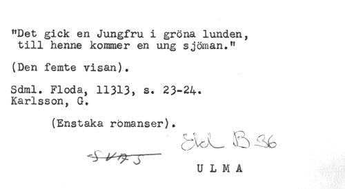 //// "Det gick en Jungfru i gröna lunden, //// till henne kommer en ung sjöman." //// (Den femte visan). //// * //// Sdml. Flöda, 11313, s. 23-24. //// Karlsson, G. //// (Enstaka romanser). //// t*- ^ v //// ^^ b ^ //// ^ u L M A ////