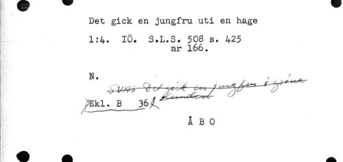 //// Det gick en jungfru uti en hage //// 1:4. IÖ. S.L.S. 508 s. 425 //// nr 166. //// N* //// /^Ekl. B 36^ ^ ^ //// ÅBO ////