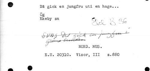 //// * Dä gick en jungfru uti en hage... //// ** //// Og //// Eke by sn ^ , ^ //// r //// NORD. MUS. //// E.U. 20310. Visor, III s.880 ////