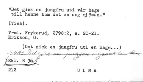//// "Det gick en jungfru uti vår hage //// till henne kom det en ung sjöman." //// ( Visa). //// Vrml. Frykerud, 2793:2, s. 20-21. //// Erikson, G. //// (Det gick en jungfru uti en hage...) //// ^Ekl. B J^T* //// 212 U L M A ////