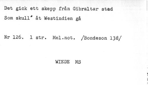 //// Det gick ett skepp från Gibraltar stad //// Som skull* åt Westindien gå //// Nr 126. 1 str. Mel.not. /Bondeson 133 //// /WIEDE MS //// t ////